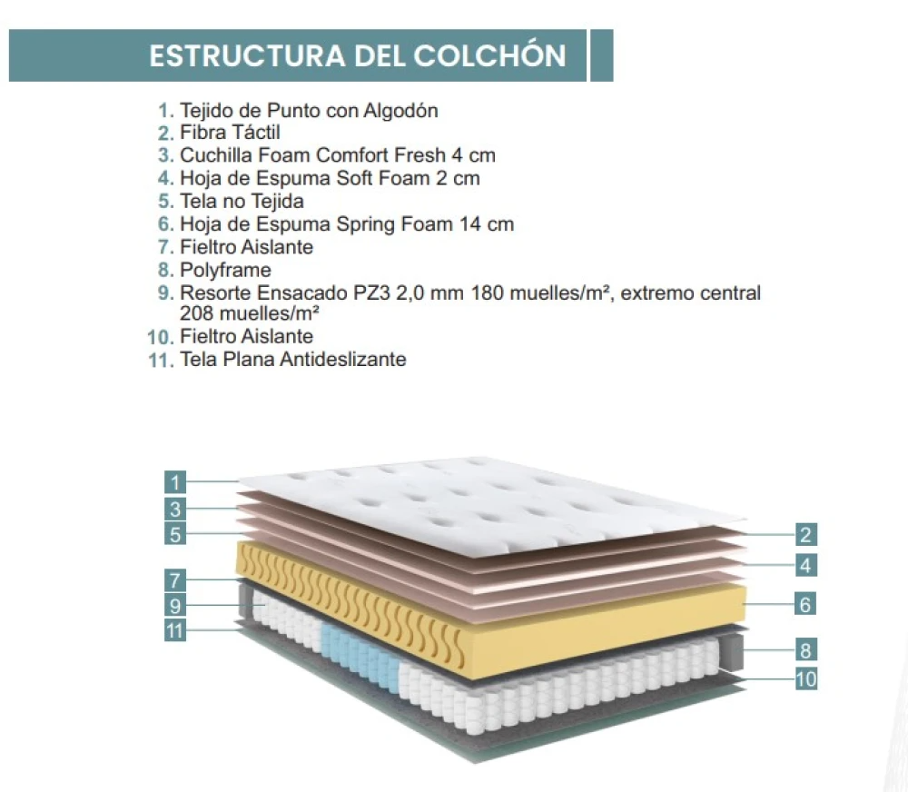 ✔ Spring Foam: ofrece mayor soporte y proporciona una sensación de la flexibilidad de los resortes, previniendo la deformación y aumentando la durabilidad.