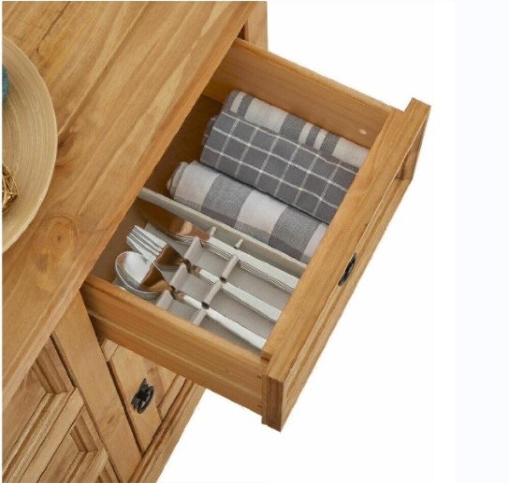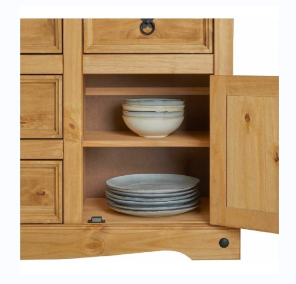 Con cinco cajones espaciosos y dos puertas con estantes internos, ofrece una excelente capacidad de almacenamiento para ropa, vajilla u objetos personales. Su acabado en cera clara natural realza la textura del pino, brindando un aspecto natural y acogedor, ideal para dormitorios, comedores o livings.